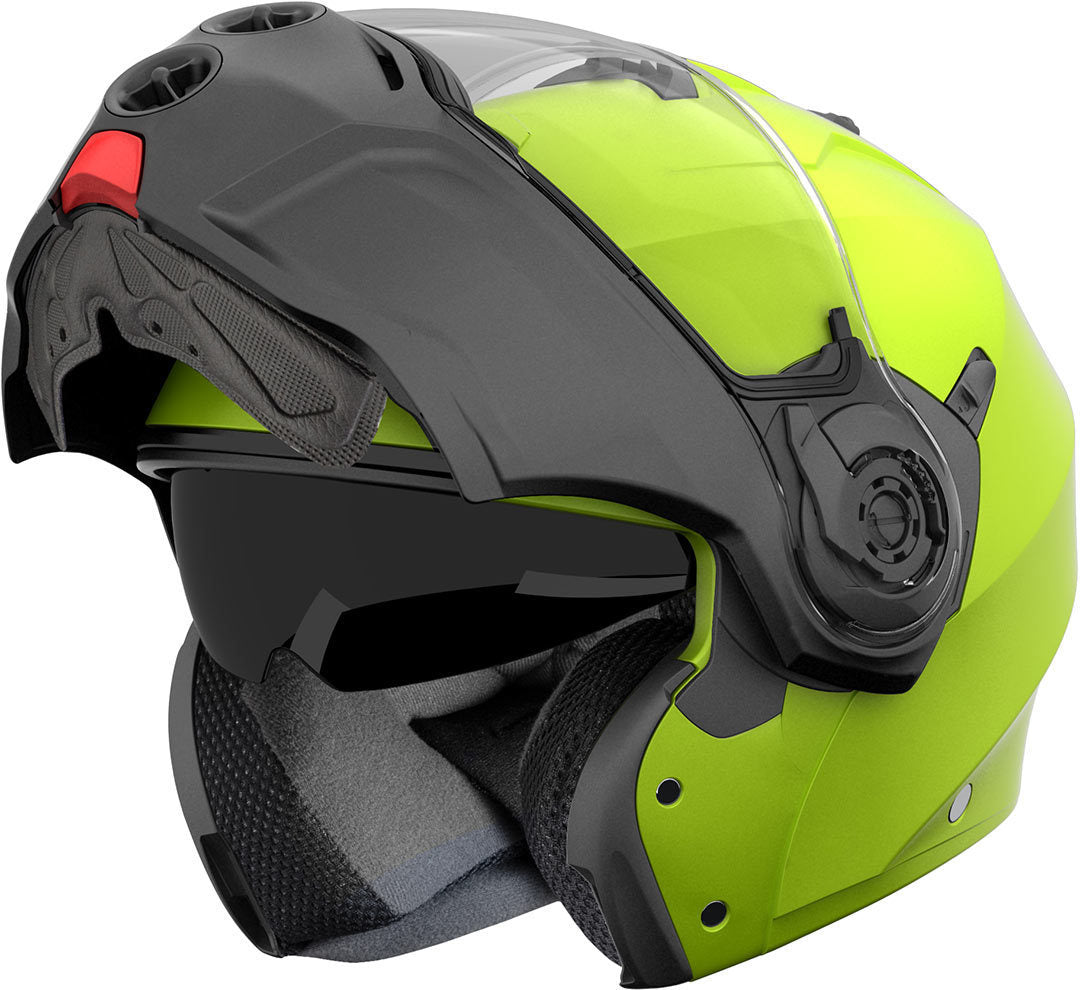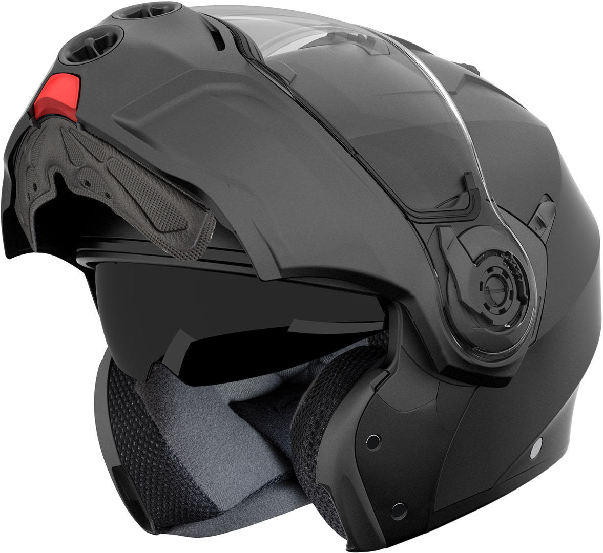 DROID is equipped with the exclusive Double Visor Tech system that, thanks to the easy to use inner sun-visor, allows to ride always with the right light and in safety. The inner sun-visor is treated anti-scratch, while the outer clear visor is not only anti-scratch but also anti-fog thanks to the Max Vision Pinlock lens. The lining, made with the best hypoallergenic and transpiring fabrics to grant maximum freshness, is entirely removable and washable. Moreover the cheek pads have been conceived to permit the accommodation of glasses.