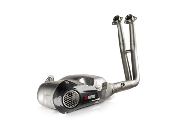 This is a completely new exhaust designed from scratch and constructed using lightweight race-proven materials. A carbon-fibre muffler outer sleeve, heatshield, and clamp, a titanium end cap, stainless-steel header, resonator, and link pipe, and a black-coated aluminium muffler bracket create a weight saving of 39.6% (3.2 kg)...