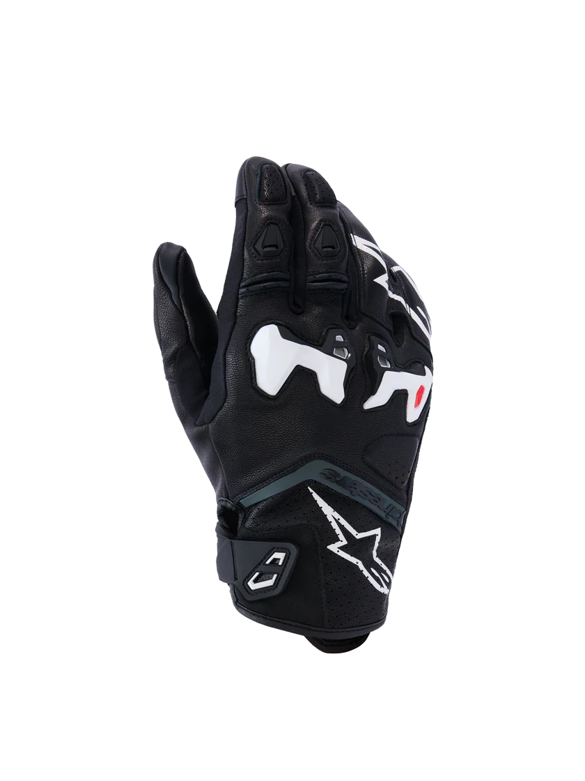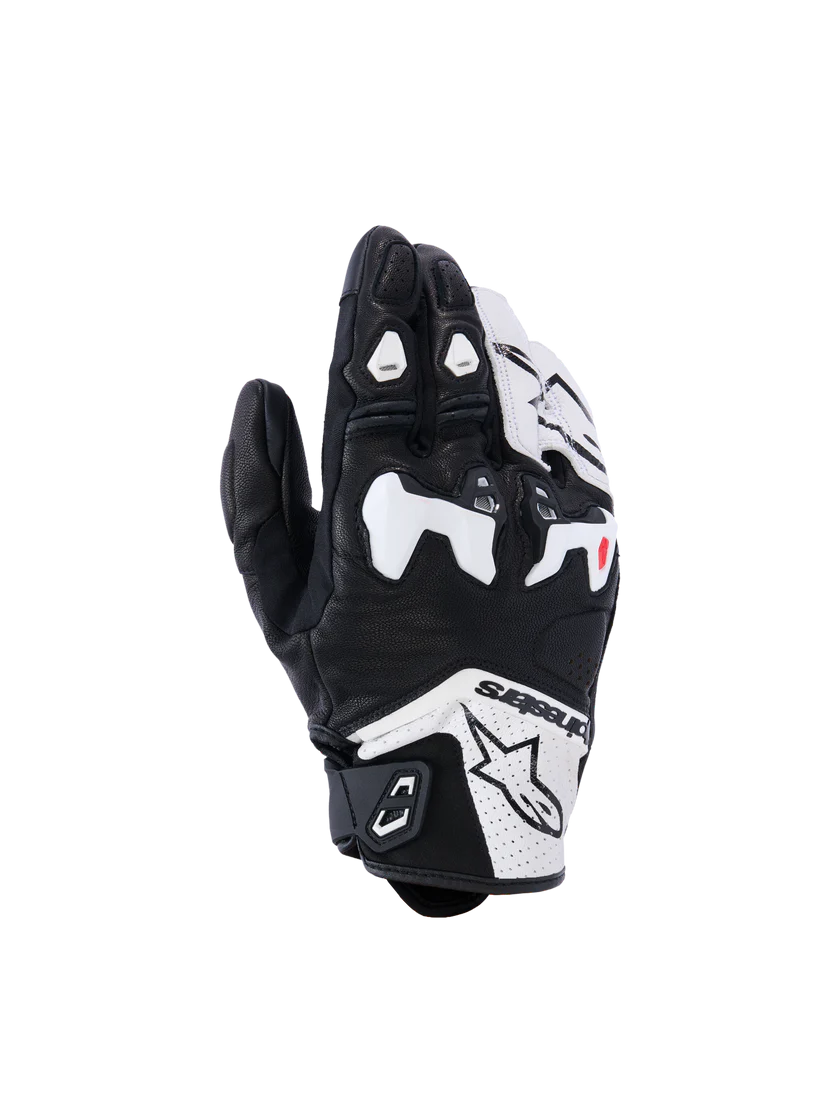 A short cuff sport riding glove, the SP-R Tech Leather Glove is engineered for performance when riding supernaked and hypermotard bikes. Constructed from highly abrasion resistant, full grain goat leather and synthetic leather material, its protective too thanks to its cutting edge MotoGP-derived SP-R divided knuckle. Equipped with Alpinestars patented finger bridge, and a new anatomically profiled grip insert on the palm and thumb, this versatile glove ensures an optimized performance riding fit and high levels of movement and comfort.