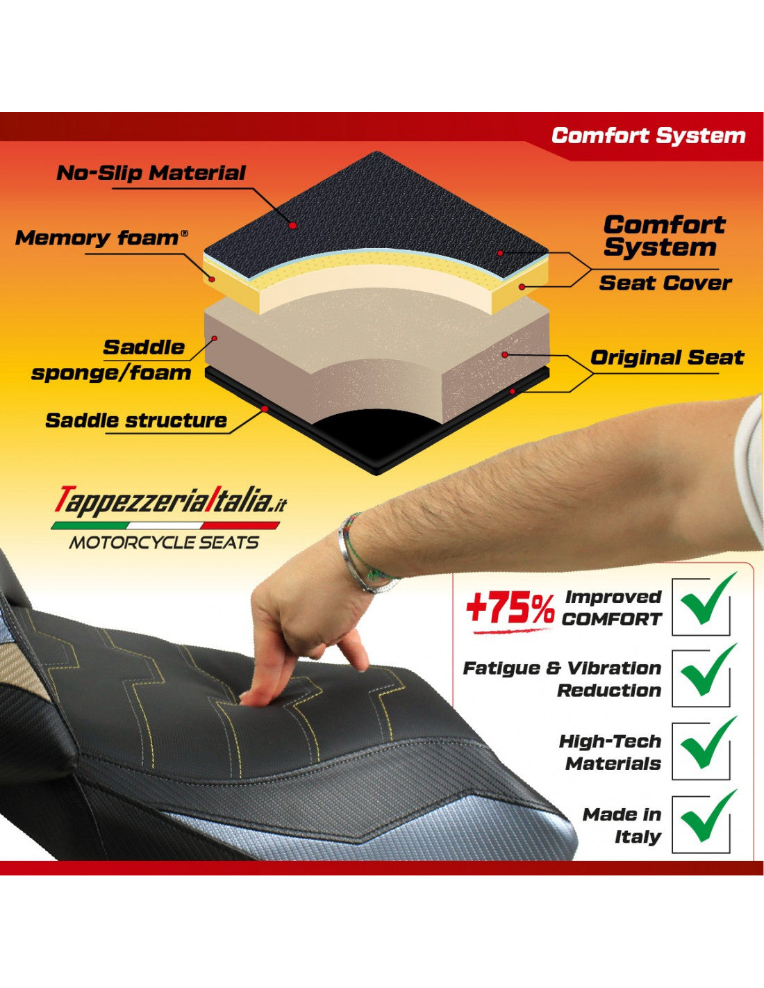 Designed to provide a superior riding experience, the Comfort System by Tappezzeria Italia is an exclusive technology developed to enhance riding comfort and reduce fatigue for both rider and passenger, especially on long journeys.