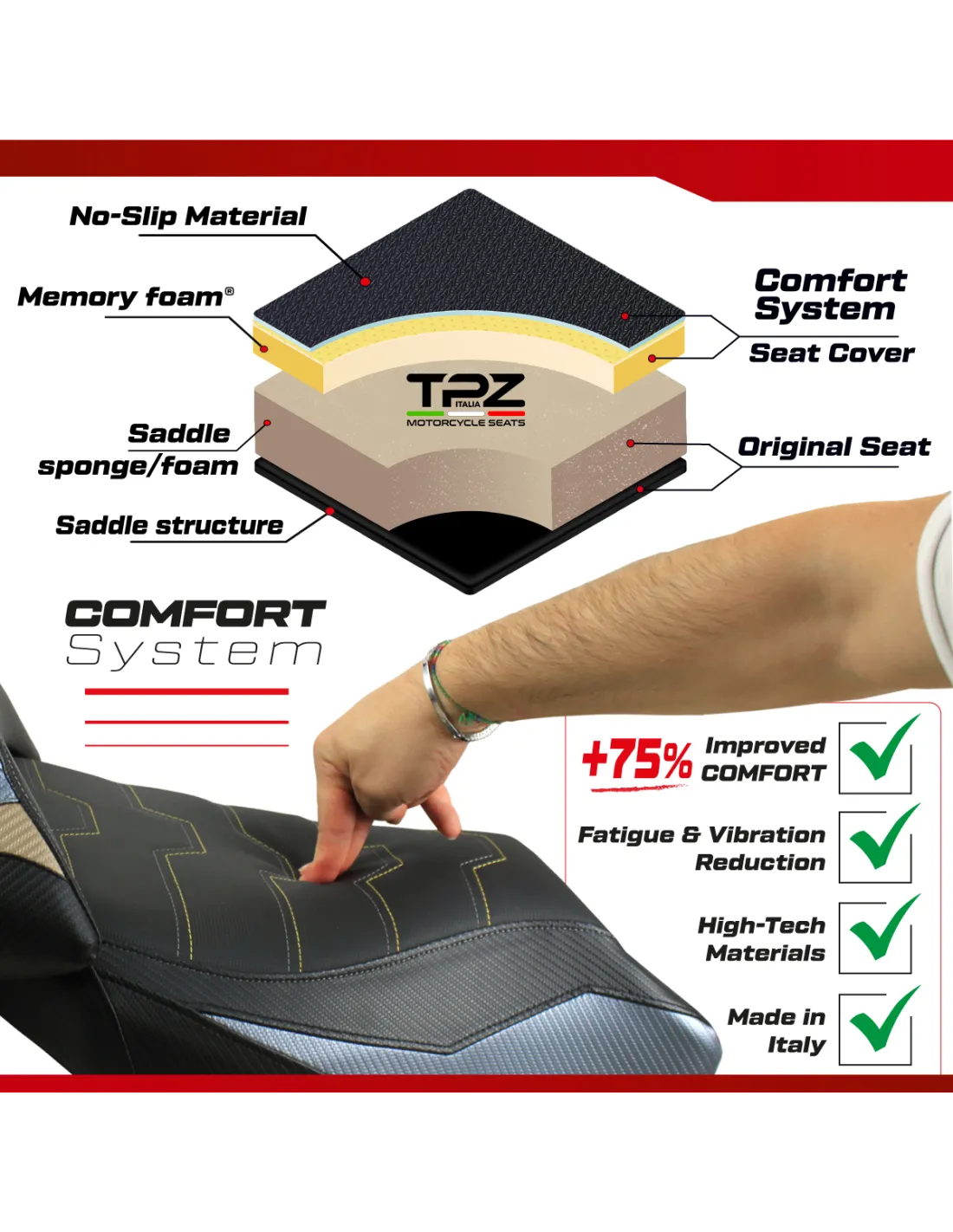 Designed to provide a superior riding experience, the Comfort System by Tappezzeria Italia is an exclusive technology developed to enhance riding comfort and reduce fatigue for both rider and passenger, especially on long journeys.