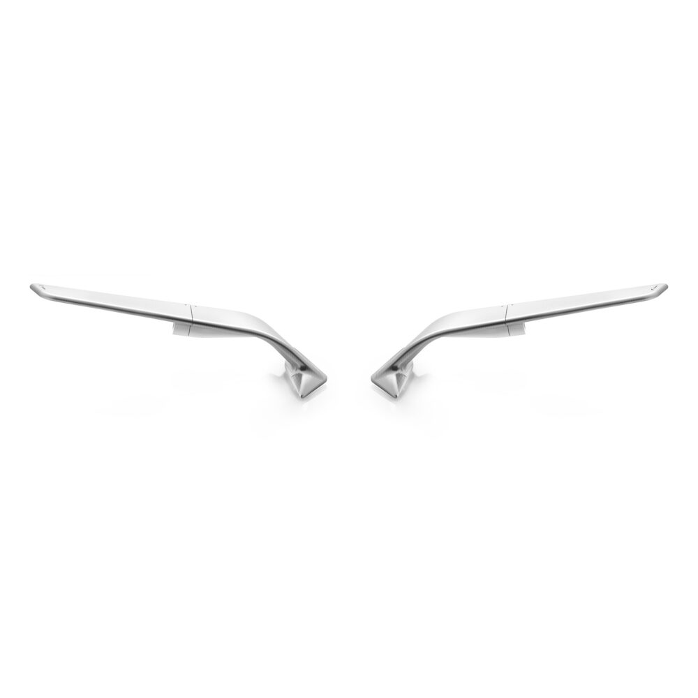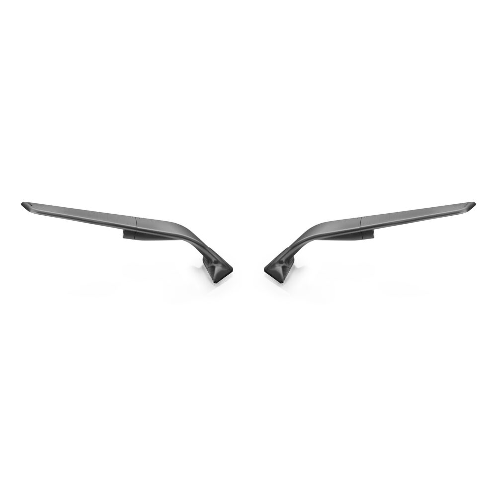 Two elements: a fixed base integrated into the fairing and a movable body that houses the glass. With a single motion, the structure compacts, transforming the mirror into an aerodynamic wing. The result: tangible downforce, up to 4 kg at 300 km/h. Milled from a single block of aluminum and finished with deep anodization, it features a convex HD blue-tinted lens for a sharp, glare-free view.