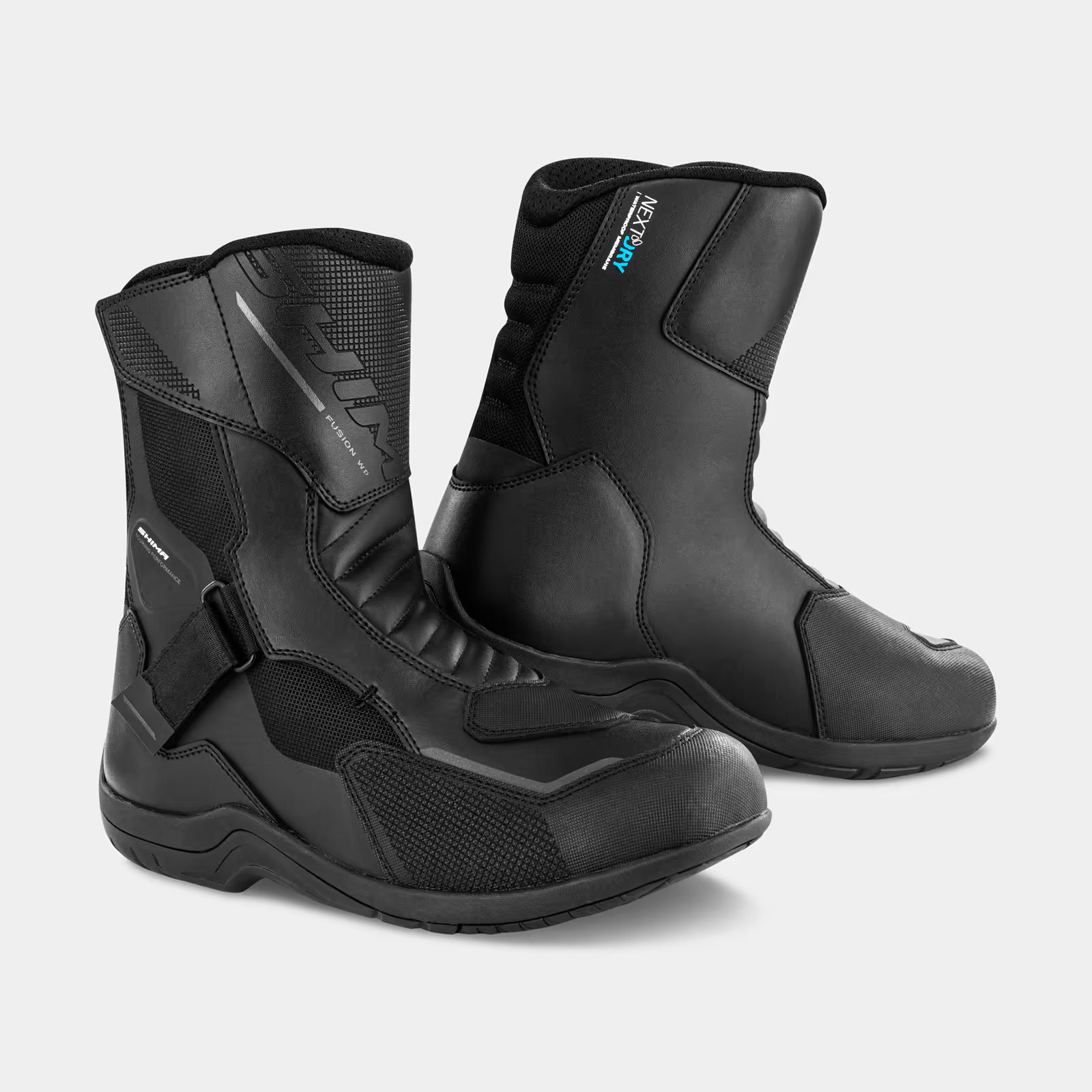 The SHIMA FUSION WP boots are entry-level touring motorcycle boots offering reliable protection, comfort and functionality on the road. Made from durable materials, they provide reinforced protection in key areas - the heel, ankle and toe - for safe riding. A reinforced shifter panel and rear TPU reinforcements further enhance durability. The polypropylene insole ensures structural rigidity, stabilizing the foot during rides. The boots are equipped with a NextDry waterproof membrane, which effectively protects against rain while allowing air circulation to maintain thermal comfort. This makes the FUSION WP boots suitable for various weather conditions, keeping feet dry and comfortable. Comfort is enhanced by a convenient hook-and-loop closure that allows easy adjustment around the ankle and upper, accommodating different foot and leg shapes. The soft upper finish and specially designed lining provide exceptional comfort, even during extended rides. Additional features, such as a non-slip sole and easy-to-clean fabric protection patches, make the boots practical and user-friendly. The boots also feature the Night Vision System, increasing rider visibility after dark with reflective elements on the upper and back. The FUSION WP boots are an excellent choice for motorcyclists who value comfort and reliable protection at an affordable price.