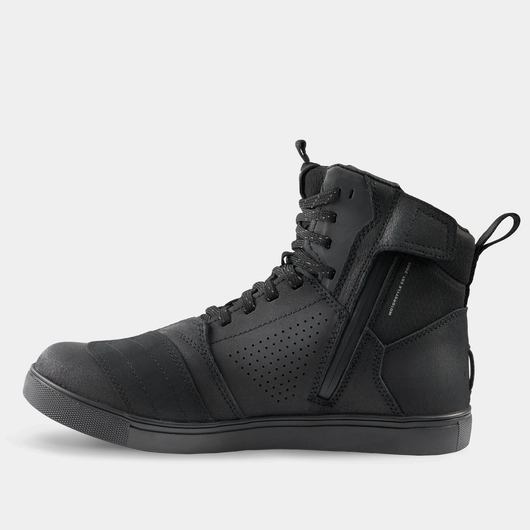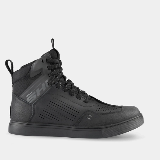 Discover the new generation of SHIMA REBEL 2.0 motorcycle sneakers, which combine urban style with trusted functionality. The boots are characterised by high water resistance, thanks to the membrane used and the splash-proof side zip. The safety of the REBEL 2.0 WP is based on the robust reinforcements at the heel, ankle and toe and the transversely reinforced rubber sole, ensuring stability and protection in all road conditions. The inside of the boot is additionally enhanced with a polypropylene reinforcement insole. The model is equipped with non-slip ribbing for shifting gears, placed on a modern overlay made from a separate piece of material. The special design of the boots is adapted to the position of the feet when riding a motorcycle, ensuring stability and comfort even on long tours. Additional features such as a lace guard, large reflective panels and adjustable laces make the REBEL 2.0 WP boots not only functional but also very practical. Available in a classic black colour and in a wide size range from 41 to 48, these sneakers are the ideal choice for all motorcyclists who do not want to sacrifice either safety or style when riding on the road.