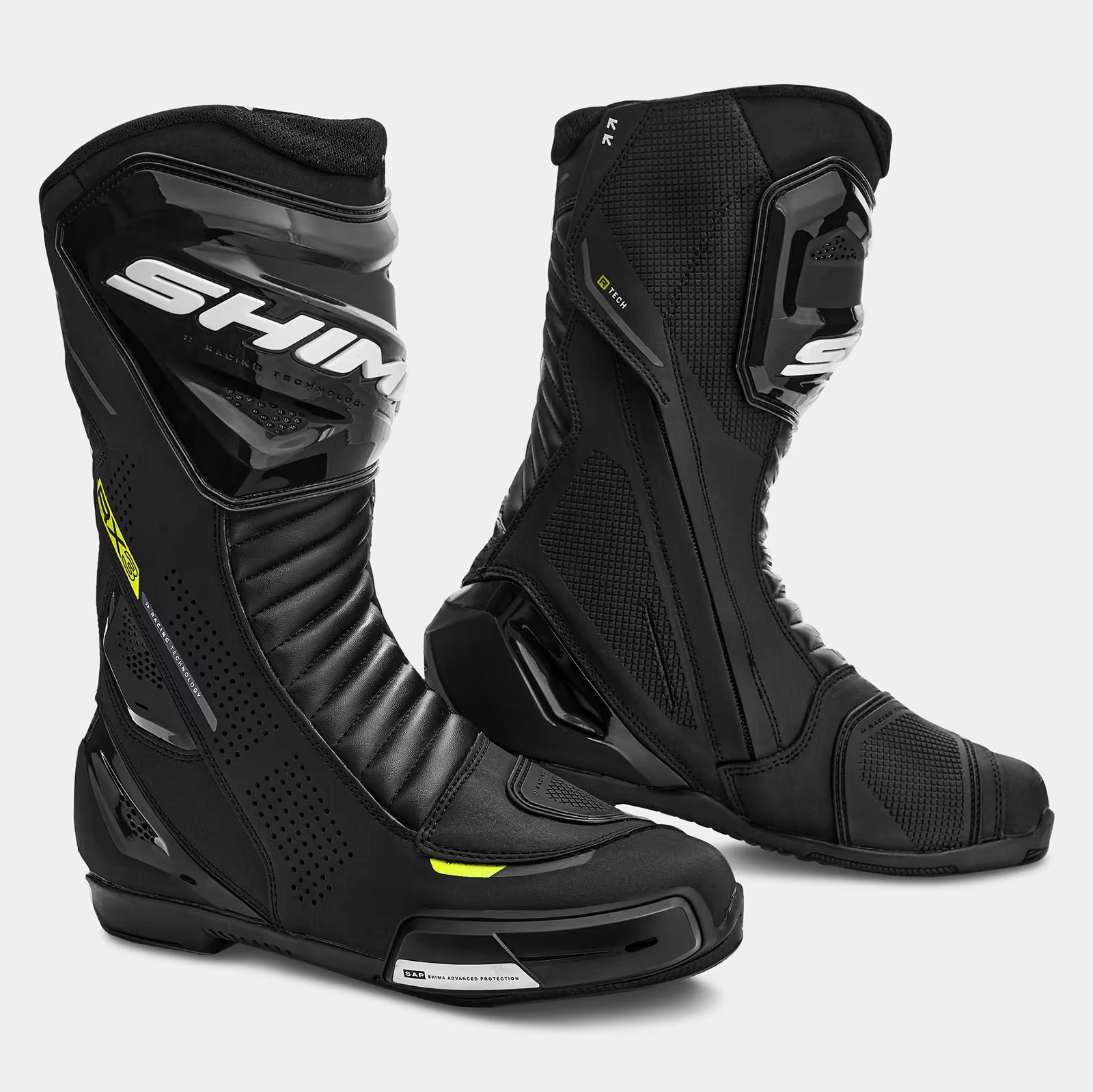 SHIMA RX-3 boots are long, sport-touring motorcycle boots that combine advanced protection with comfort for any ride. Made from a combination of leather and microfiber, they offer a precise fit and exceptional durability. SAP™ protectors with TPU on the ankle, reinforcements on the heel, toe and shin, as well as a replaceable SAP metal slider on the toe, ensure the highest level of safety for both dynamic riding and extended trips. An internal polypropylene insole enhances structural rigidity, providing optimal foot stabilization. The RX-3 boots feature perforated leather for excellent ventilation, making them an ideal choice for long, demanding routes. A soft lining and ergonomic upper ensure superior comfort, even during long hours of riding. Additional features, such as a zipper cover and a TPU overlay for shifting gear, enhance the boots' functionality for everyday use. The Night Vision System improves visibility with reflective elements on the front and back of the boots, increasing safety in low-light conditions. Available in classic BLACK for touring enthusiasts, as well as sporty, vibrant colourways such as BLACK/WHITE, YELLOW FLUO, and RED FLUO, in sizes 41 - 48, the SHIMA RX-3 boots are the ideal choice for those seeking a perfect balance of protection, comfort, and dynamic style on the road.